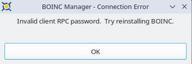 Invalid client RPC password. Try reinstalling BOINC.