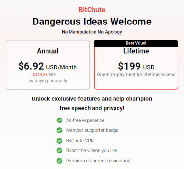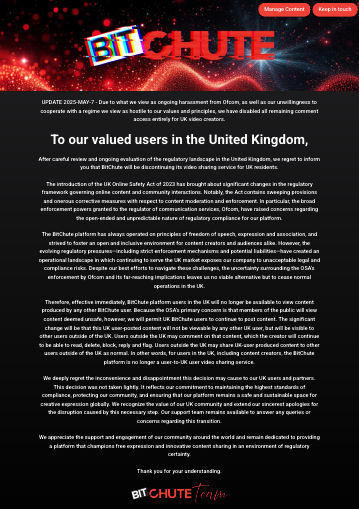 Bitchute, in a PDF (above) dated May 2025, begin with "Due to what we view as ongoing harassment from Ofcom, as well as our unwillingness to cooperate with a regime we view as hostile to our values and principles, we have disabled all remaining comment access entirely for UK video creators." [my emphasis] highlights that the contradiction that they are cooperating! The very Act doesn't want them to be making their content accessible to anyone in the UK (except to those preparing to comply with a request for ID). Bitchute illustrates that they lack values and principles of any note. They go on to say "To our valued users in the United Kingdom..." which is an insult because they clearly don't value us, since they're not prepared to stand up for us. Their hypocrisy is apparent when you read their subscription offers: