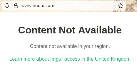 Further irony comes in the form of a VPN which is included with their deals; and a VPN is all that is needed to circumvent the block. The weird thing is that even Youtube hasn't complied with the Act, although I'd recommend Rumble as being a video platform that supports free speech. Next up is Imgur. This image-sharing platform is once I had been using while at the same time despising; the left-wing nature of the feed when first arriving at the site was full of left-wing memes attacking anything that might be considered right-wing, but I used the siteregardless just so I could upload the occasional image to share with someone else. Imgur put a stop to this with their stance on the Online Safety Act: