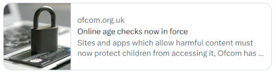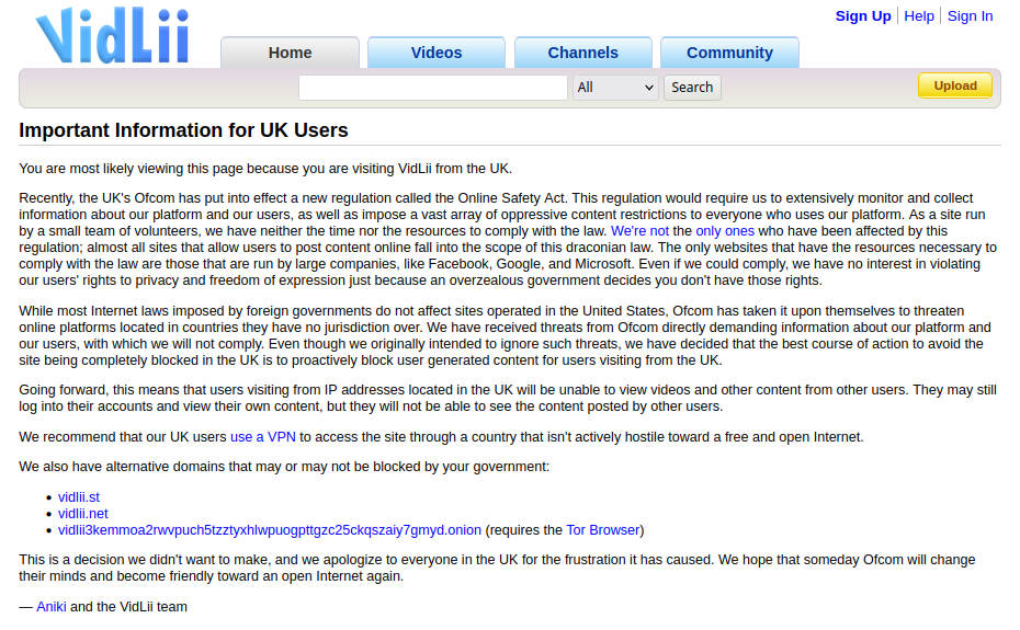 to Compliance Due to residing in the UK, I've been subjected to a few internet annoyances over the years. It's especially sad because I considered the internet to be open and free in the early years (late nineties/early 2000s). One such annoyance has involved the utterly pointless irritation of Cookie Requests and GDPR which plague any of us (UK/EU citizens) who visit a website for the first time (or the first time on a fresh clean web browser). From what I have seen, most people are oblivious to what a cookie request notice actually means and they click either option, Accept or Decline, but probably more often "Accept All Cookies" because that's surely like agreeing to Ts&Cs, which "of course you need to do, otherwise you can't get in... right?" Furthermore, there are websites that appear to comply with the cookie request notice but make the opting out process as painful as possible. 2025 though, saw the rollout of the UK's so-called Online Safety Act, or more accurately it saw the rollout of reactions to the Act, usually in the form of notices presented to visitors in the UK. I list some examples below and I do so to highlight these platforms as generally complicit in what will surely become the negative knock-on effects of the Act, such as a step along the path of Digital IDs, not to mention the potential for similar Acts to be rolled out in other countries.