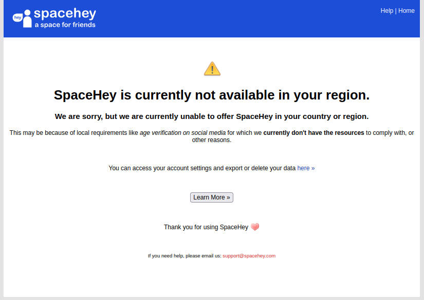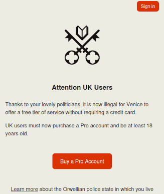 This is due to the number of people using each of the available VPN connections and to Venice's systems these must look like one user. There are arguments against using a VPN for general day-to-day use, so I typically only fire one up when I feel the need. VidLii were one website I landed on which blocked me but actually encouraged me to use a VPN; it was basically like saying "if we don't know you're from the UK, then you're allowed in." For how long will VPNs remain legal to use by residents of the UK though, since they have been banned in some other countries? This will of course move the legality, and the risk of penalty, to the user, and away from the websites. SpaceHey are a vague in their notice, which appears more of a generic notice which they can deploy for a variety of reasons. "We don't have the resources to comply..." then don't?